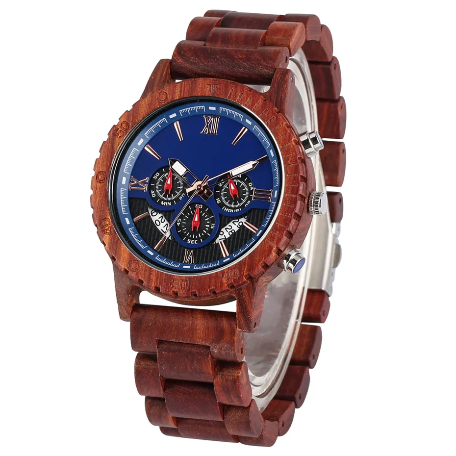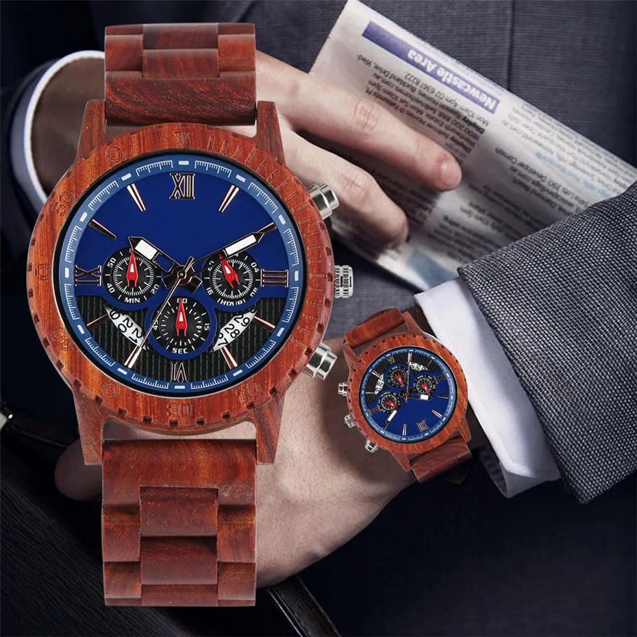 HOT SALE Sport Men's Watch Chronograph Calendar Male Timepiece Quartz Movement Luxury Red Wooden Watch Case
