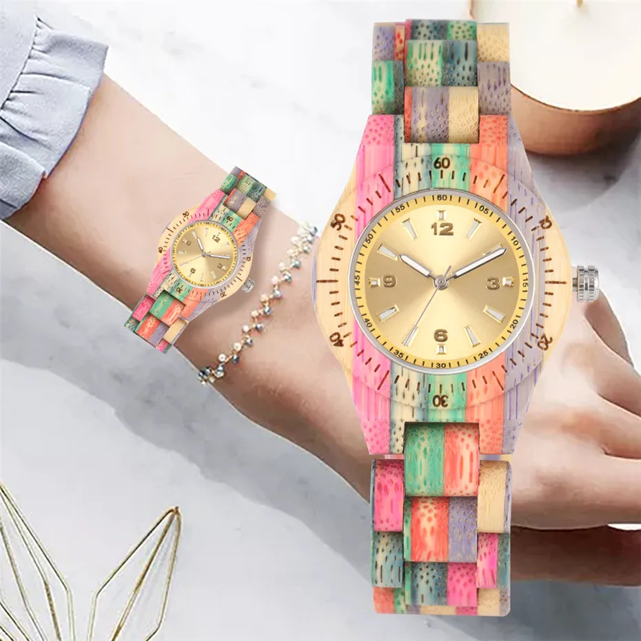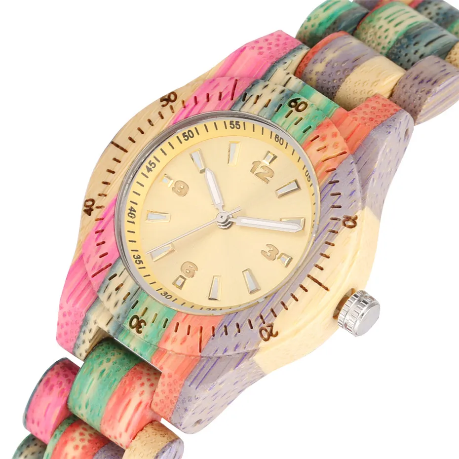Creative Rainbow Colorful Bamboo Wood Watch Women's Bangle Wristwatch Yellow Round Dial Folding Cla